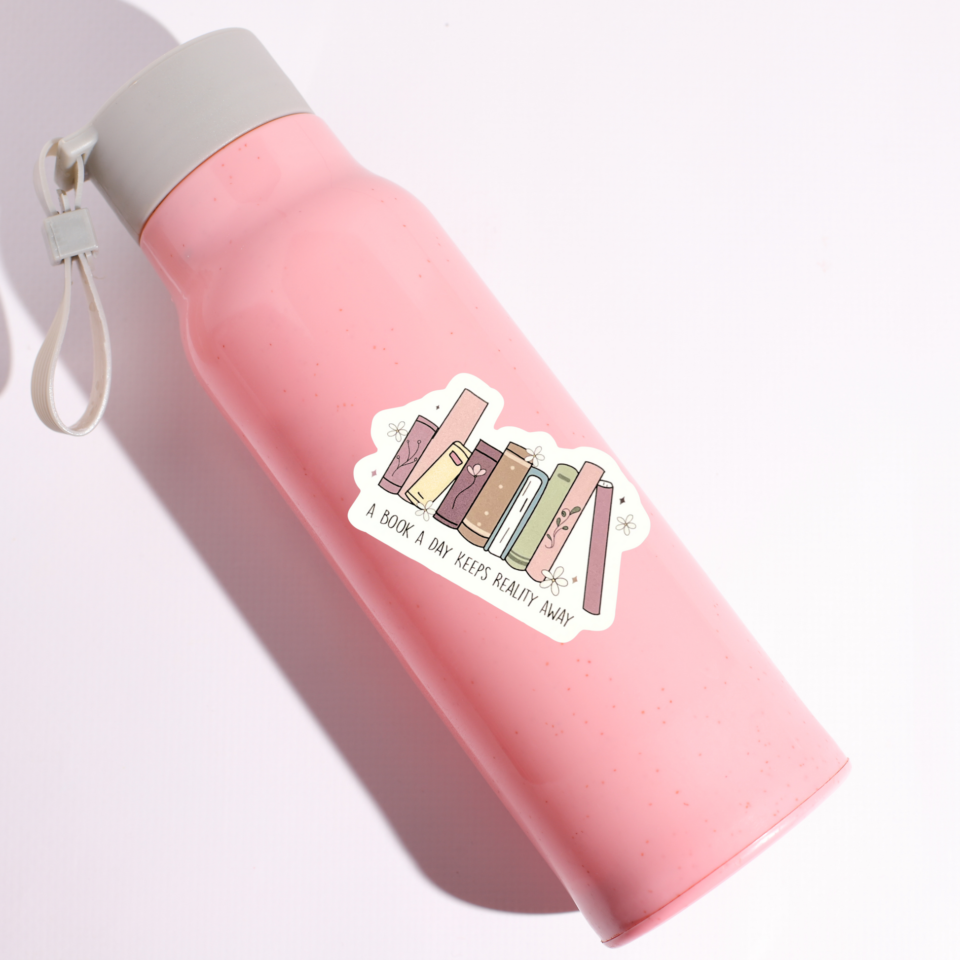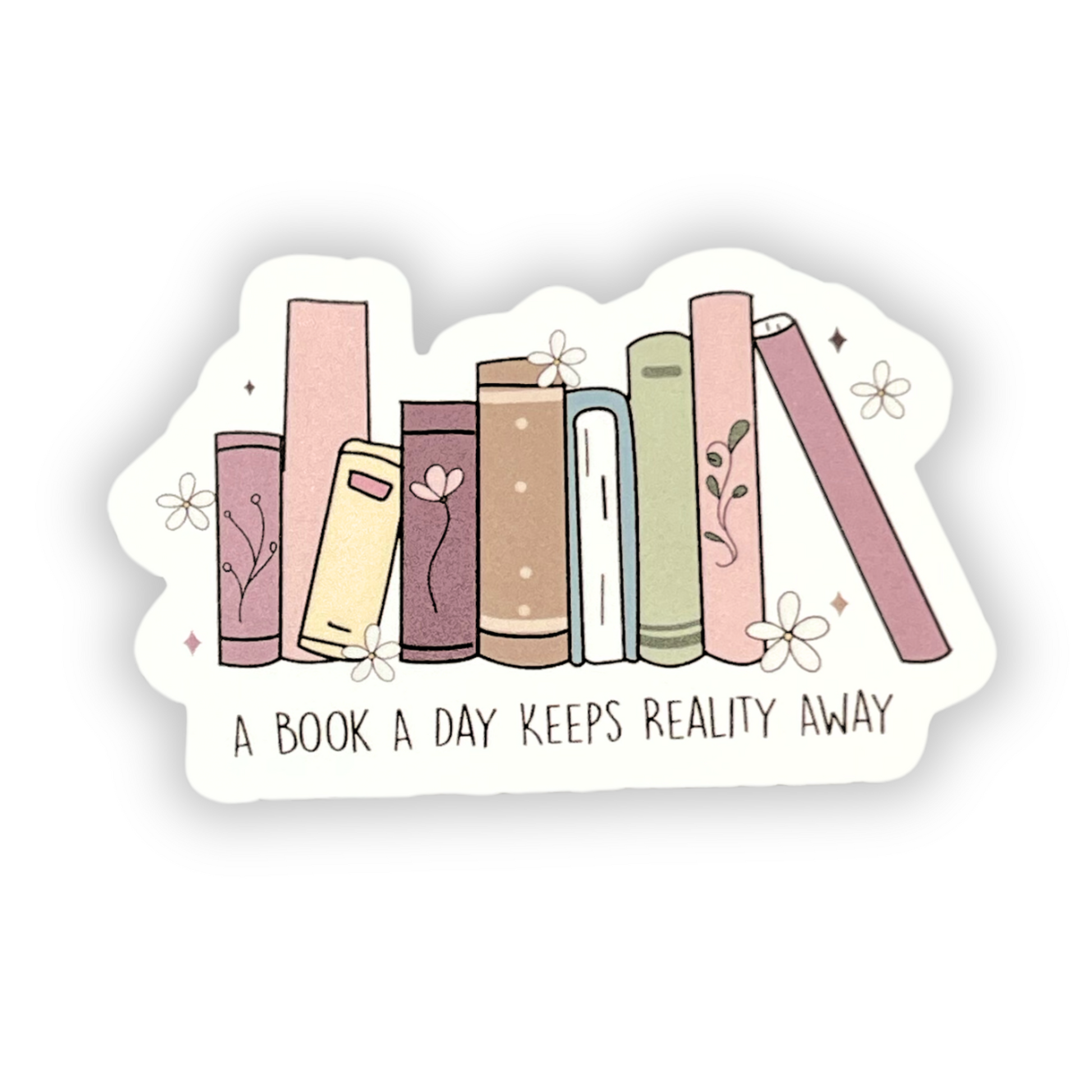 Escape the mundane with our "A Book A Day Keeps Reality Away" die-cut sticker. Featuring a row of books in soft pastel colors, this 3 in sticker is the perfect reminder to indulge in your favorite stories and leave reality behind. Stick it on your laptop, notebook, or anywhere you need a literary escape. #BookLoversUnite