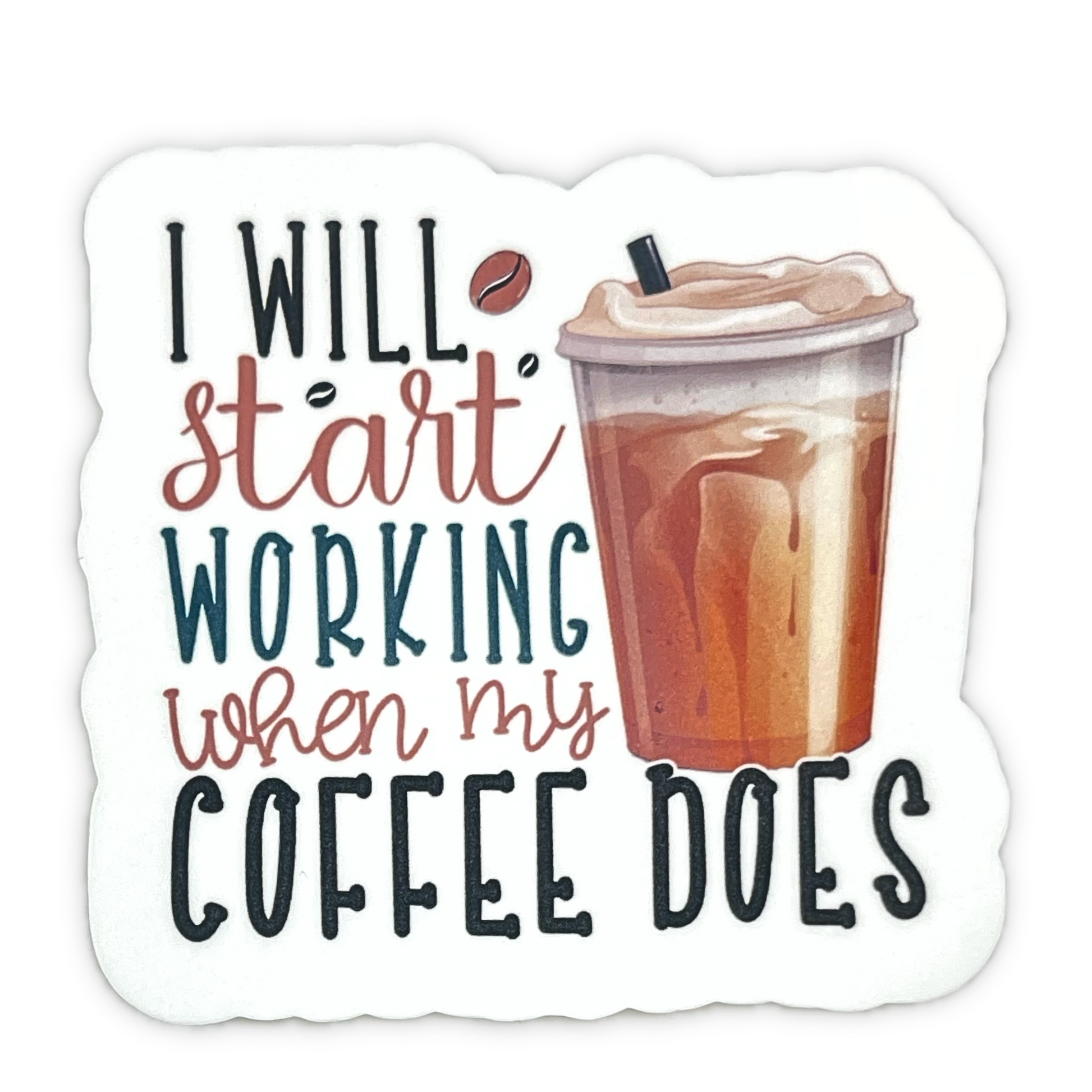 Stay motivated with our "I will start working when my coffee does" die-cut stickers. Made with waterproof material and measuring 3 inches, these stickers are perfect for decorating your iced coffee drink and reminding you to stay on track. Get yours now!