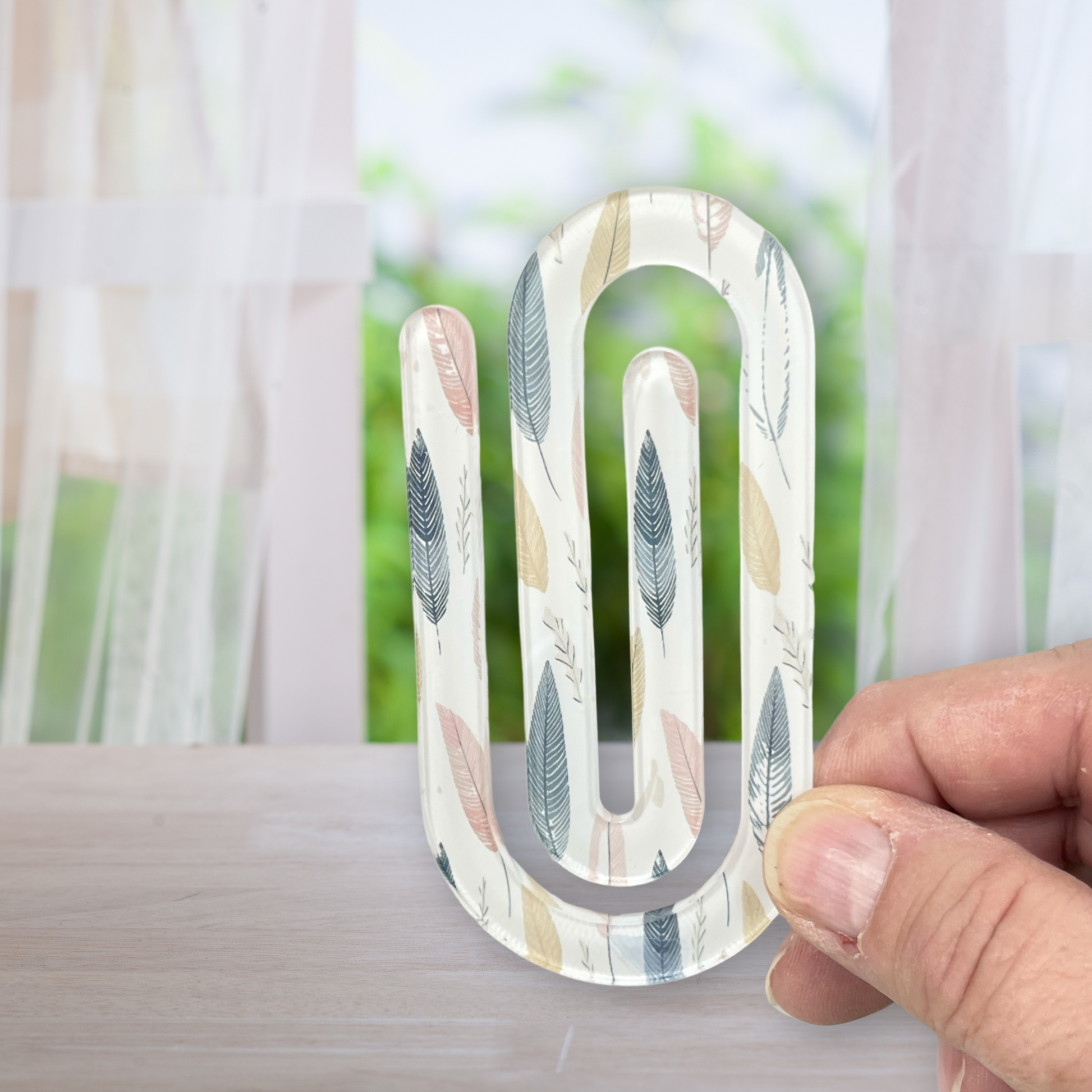 Add a touch of bohemian charm to your everyday tasks with our Boho Feathers Jumbo Paperclip. Its muted pinks, blues, and yellows, paired with glossy acrylic material, exude a cool, hippie vibe. Measuring 4x2 inches, it's perfect for holding journals, papers, photos, and even bookmarking your favorite pages.
