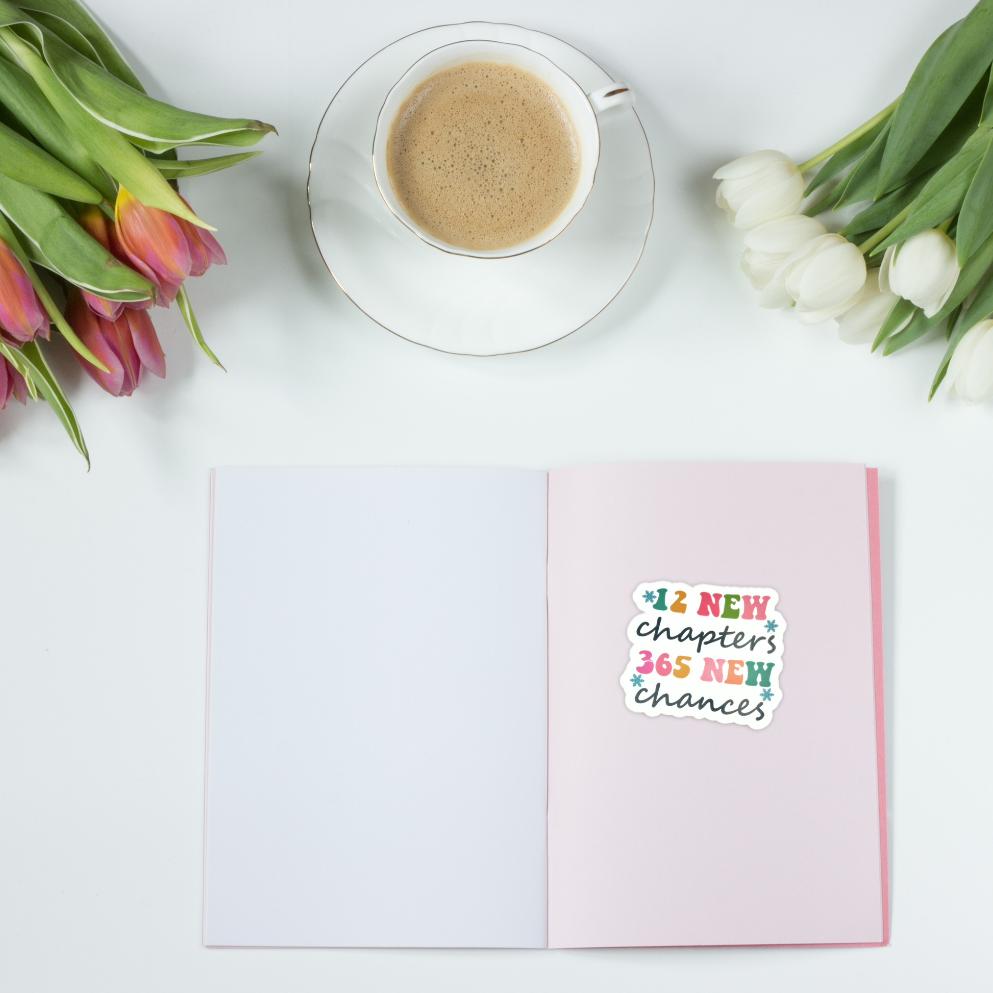 Start your year off right with our "12 New Chapters 365 New Chances" die-cut sticker! Measuring 3 inches and featuring a bright and positive design, this waterproof sticker is the perfect reminder to embrace new opportunities. Add it to your water bottle, laptop, or any other surface that needs a pop of color and motivation.